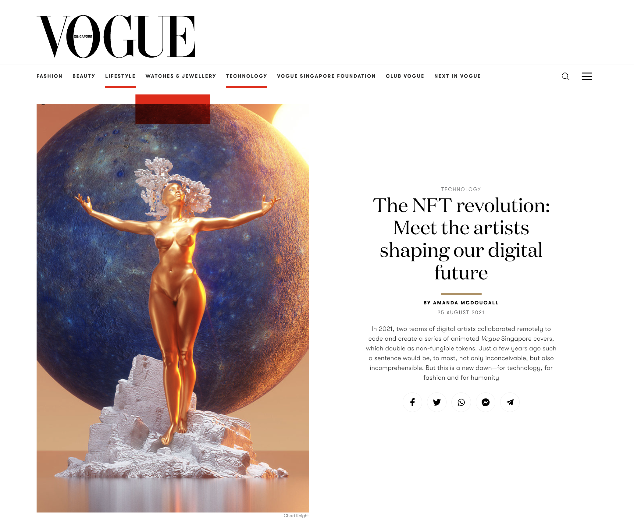 Collaboration with Vogue Singapore. Created the 3d gallery design for ‘New Beginning’ of the 2021 September issue. Vogue Singapore explores the creative renaissance born out of digital innovation with an issue dedicated to Non-Fungible Tokens(NFTs). Enter the fashion metaverse to discover two virtual-only covers.